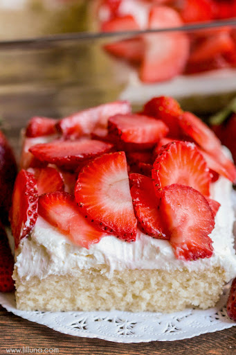 In a large bowl, cream together cream cheese, powdered sugar and frozen whipped topping. Evenly spread cream cheese mixture over top of cooled cake. Top with diced strawberries.