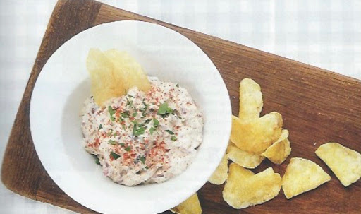 In a medium bowl, combine the sour cream, flaked smoke mackerel, chives, partly and smoked paprika. Roughly chop the cooked onions and then combine the sour cream mixture. Season to taste with salt and pepper, Cover and refrigerate at least two hours before serving.