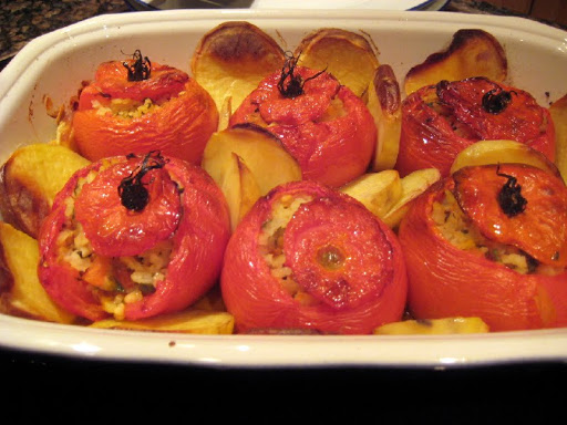 Fill each tomato almost to the top with the stuffing mixture and replace the caps. Season potato slices with salt and place the them in between and around the tomatoes. Drizzle everything with the remaining 2 tbsp oil. Bake for 45-60 mins, and serve hot.