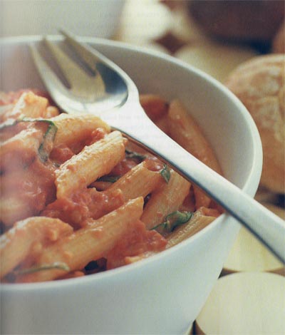 Stir cream into the vodka sauce. When sauce returns to a bubb* from heat. Toss hot pasta with sauce and basil leaves. Serve along with crusty bread.