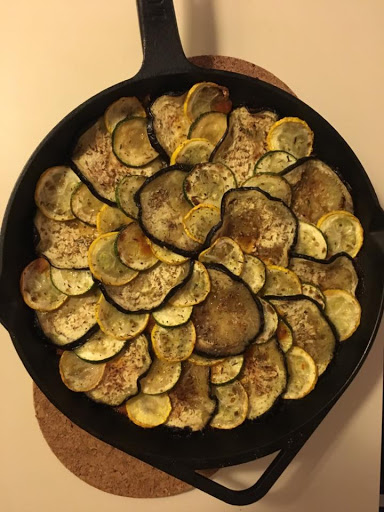 - 3/4 pound summer squash (about 2 medium), ends trimmed and thinly sliced crosswise between 1/8 and 1/4 inch thick