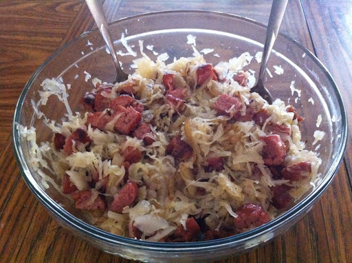 While the sauerkraut is heating up cook the bacon in a small skillet.