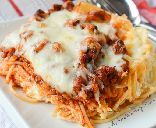 In a 9x13-inch casserole dish, pour creamy spaghetti mixture in and top with 3/4 of the pasta sauce, TOSS WELL.
