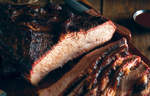 Set the brisket on a carving board, with the point to your left and the flat facing right. Begin carving the brisket, against the grain, on the flat (right) side, moving right to left as you carve. Once you reach the midpoint of the brisket, turn the brisket 90 degrees to the right so that the point is facing away from you and the exposed (cut) end of the brisket is facing you. Begin carving from the right side and continue carving from right to left until the entire point is carved. (Carving the brisket this way will enable you to cut across the grain of both muscle masses, so the meat is as tender as possible.) Serve warm.
