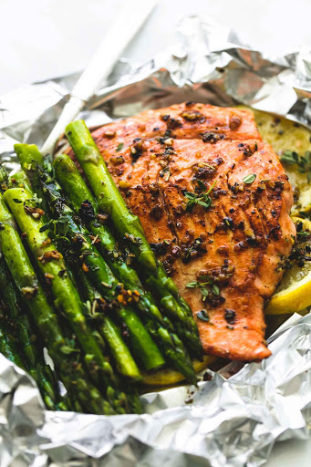 Fold the foil tightly around the salmon and asparagus, being sure to seal the ends together tightly so the juices and butter doesn't run out while cooking. Grill over medium high heat for 6-8 minutes on each side, OR bake at 400 degrees for 20 minutes, until asparagus is tender and salmon is flaky.