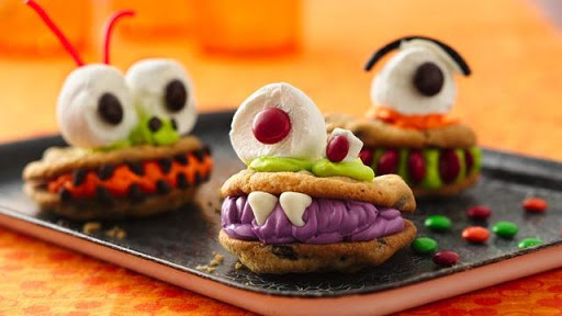 3 To decorate, press remaining white vanilla baking chips in frosting for teeth. Use reserved frosting mixture to attach eyes, using decorations as desired.