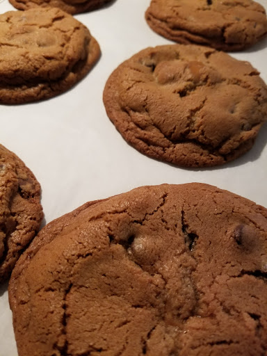 In the bowl of a mixer fitted with the paddle attachment, beat together flour, both sugars, baking powder, baking soda, and salt. Add butter; beat on medium speed until combined but some pea-size butter chunks remain. Add chocolate chips and beat until combined, then beat in eggs, one at a time, and vanilla.