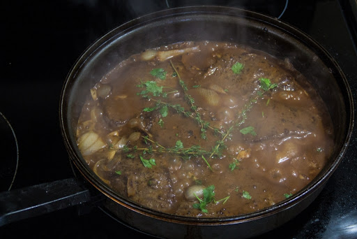 Return your meat back to the pan and place it directly on top of the onions. Then go ahead and pour in 2 cups of water. Place your herbs into pan and let them all cook together. Bring it to a boil, then bring it back down to a simmer and let it for at least an hour and a half.