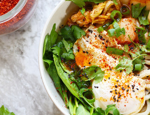 03/09/17 - VG as written. I poached the egg until the white was fully set and the interior of the yolk was still soft but not runny, then cut it in half. The spice level was pretty mild, although that would depend on the brand of Kimchi