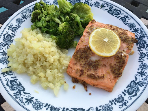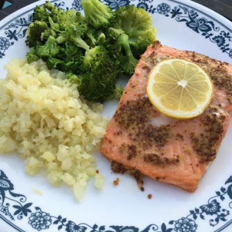 Baked salmon with choice of sauce; raspberry mustard, Sicilian lemon balsamic or soy honey mustard. Serve with riced cauliflower and green vegetable of your choice!