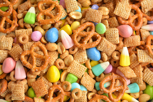 Remove from the oven and allow it to cool. Then add it to a large bowl, along with the candy corn, M&M's and Reese's eggs. Toss to combine.