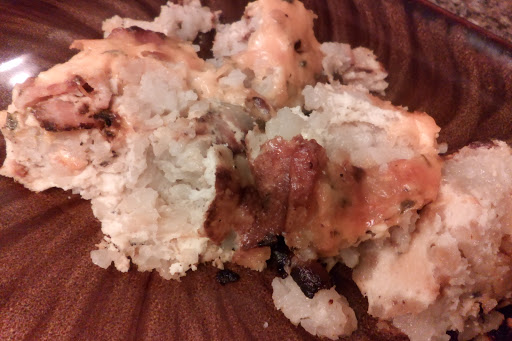 Preheat oven to 350. In a large skillet, cook onion and bacon until done, drain.
