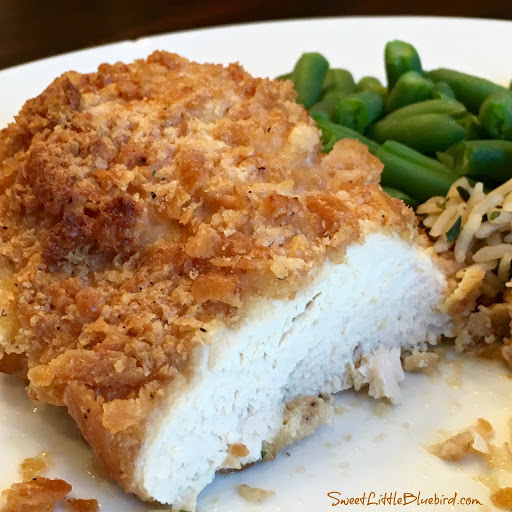 Arrange coated chicken in a 9x13 inch baking dish. Place pieces of butter around the chicken.