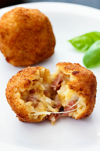 Scoop about ¼ cup of the risotto (rice mixture) into the palm of your hand and place 1 portion of the prosciutto/mozzarella cheese mixture on top. Shape the rice into a ball and add more rice, if necessary.