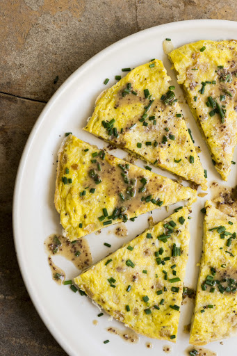 Remove from the oven. Run the spatula around the edge and under the frittata to loosen, then slide onto a serving plate. Sprinkle with 2 tablespoons of the chives. Set the empty skillet over medium-high, add the remaining ¼ cup vinegar and simmer until reduced to 2 tablespoons, 2 to 4 minutes. Off heat, stir in the mustard, then stir in the remaining 3 tablespoons butter a piece at a time until melted. Stir in the remaining 2 tablespoons chives, then taste and season with salt and pepper. Cut the frittata into wedges and serve with the sauce on the side.