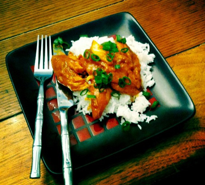 To prepare this dish you should put onions in the Actifry and cook for 5 minutes. Then add peanuts and seasoned chicken cubes and cook for 2 minutes and then add coriander leaves and garlic and cook for about 1 minute. Then add the chicken stock and cook for 5 minutes and then add cornflour. You should then adjust seasoning and serve with white rice.