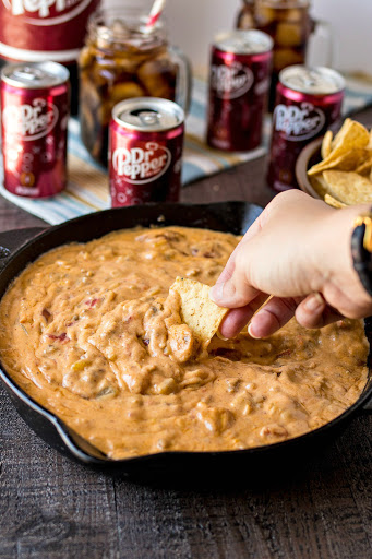 A chunky queso dip with chopped green chiles, roasted tomatoes, ground sausage, and sliced smoked cheddar sausage. The best dip to feed a hungry crowd during a tailgate. Perfectly pairs with ice-cold Dr Pepper!