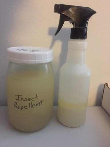 Mix ingredients in a large jar. Shake well. Store in refrigerator and use in spray bottle as needed. Shake well before each use. Spray on skin and rub to distribute.