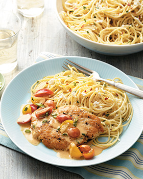 Off heat, deglaze pan with vodka and cook until liquid evaporates. Add broth and cream and reduce until thick, 2–3 minutes. Stir in tomatoes and lemon juice and bring to a simmer. Return cutlets to pan and cook to warm through, 1 minute per side.