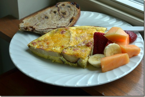 Heat oven to 350. Spray pie plate with Pam. Lay the sliced potatoes on the bottom of your pie plate - its okay if they overlap. Mix the eggs, buttermilk, cheese, ham, black pepper and Italian seasoning and mix just until the eggs are beaten.