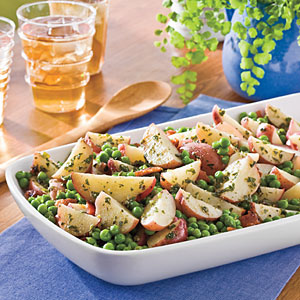 Gently toss together potatoes with peas, pesto, and lemon juice. Sprinkle with bacon.