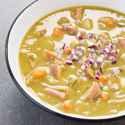 3. Add sautéed vegetables, potatoes, and shredded ham to soup; simmer until potatoes are tender and peas dissolve and thicken soup to the consistency of light cream, about 20 minutes more. Season with ground black pepper. Ladle soup into bowls, sprinkle with red onion, if using, and serve, passing balsamic vinegar separately.