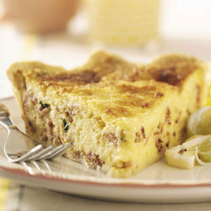 In a large bowl, whisk the eggs, cream and juice. Stir in the bacon, salt, pepper and green onions. Pour into pastry; sprinkle with cheese.