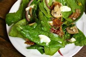 At serving time, slowly fry bacon bits in deep chafing dish, or electric skillet until crisp-cooked. Add vinegar, lemon juice, sugar, and salt. Add spinach; toss just until leaves are coated and wilted slightly. Sprinkle with egg.