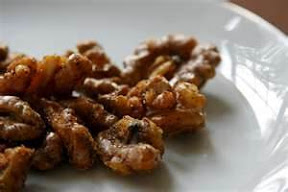Preheat oven 225* and line a large shallow baking pan iwth foil. Combine the egg white and water. Beat until foamy. Add the walnuts and toss to coat. Pour the mixtue into a strainer and let drain 2-3 minutes.