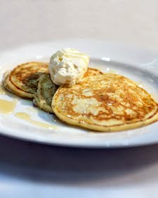 3.Heat a griddle or large nonstick skillet over medium-high heat; brush surface with butter. Working in batches, ladle 1/3 cup batter for each pancake on griddle, leaving space as they will spread. Cook until golden and top begins to bubble, 3 to 4 minutes. Gently turn and continue cooking until bottoms are light brown, 3 to 4 minutes more. Serve immediately with ricotta and honey syrup.