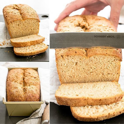 Remove the plastic wrap and place the loaf pan in the center of the preheated oven. Bake for about 30 minutes or until the loaf is firm enough to take out of the pan. Remove the bread from the loaf pan and place it on a rimmed baking sheet. Return the bread to the pan to the oven, and bake for another 5 to 10 minutes, or until the top is nicely browned and the loaf sounds hollow when tapped. Remove from the oven, allow to cool on the baking sheet for 10 minutes. Transfer to a wire rack to cool completely before slicing and serving.