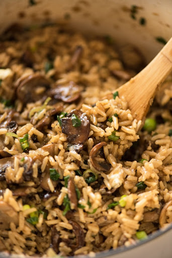 One for mushroom lovers! Worthy of being a meal in its own right, my two key tips to make an extra tasty mushroom rice are: 1) stir in half the browned mushrooms at the end 2) brown the mushrooms well so the base of the pot turns brown, then deglaze it with broth so all that flavour ends up in the rice as well as staining it a lovely earthy brown colour. The amount of liquid to rice ratio I use yields a tender just cooked rice that is fluffy. Recipe VIDEO below. Serves 4 -5 as a main or 8 as a side.