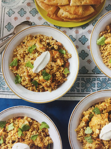 8. Divide chicken and bulgur wheat among 4 dishes. Top with spoonfuls of the sauce and drizzle with olive oil. Garnish with mint and cilantro. Serve with pita chips on the side.