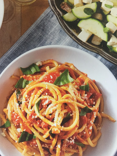 5. Divide finished pasta among 4 dishes. Garnish with parmesan cheese and remaining basil (tearing leaves). Serve with marinated squash salad.