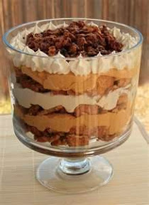 Assemble trifle: place 1/3 graham crackers evenly in the bottom of a trifle bowl. Top graham cracker layer evenly with 1/2 the pumpkin filling. Top with 1/3 graham crackers. Top with remaining maple cream. Top with final 1/3 graham crackers. Top with remaining pumpkin filling. Break up maple walnuts. Decorate the top of the trifle with the decorator bag of maple cream and the maple walnuts.
