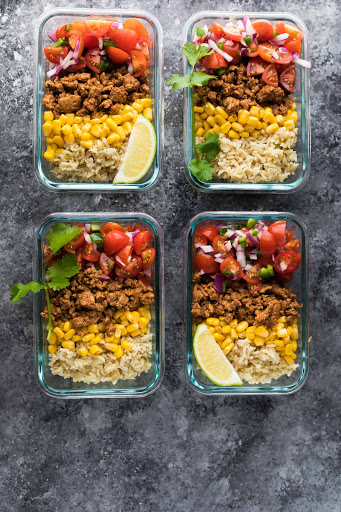 6. To assemble the taco bowls, add a base of rice to 4 food storage containers.