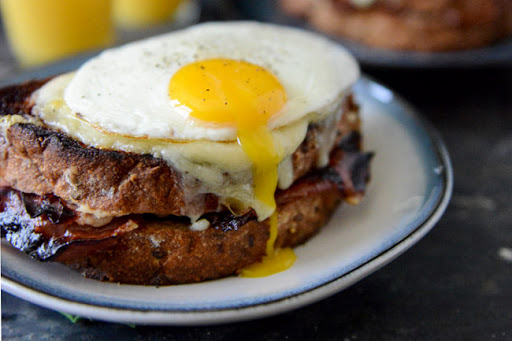 Preheat the broiler on your oven. Place the sandwiches on a baking sheet and cover the tops with the remaining cheese sauce and grated cheese. Place under the broiler for 1-2 minutes, then top each with an egg. Enjoy!