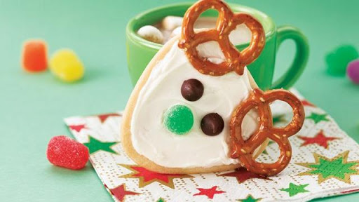Frost cookies with frosting. Place 2 pretzel twists on each triangle near corners for antlers. Lightly press 2 chocolate chips into each cookie for eyes and 1 halved gumdrop for nose. Store between sheets of waxed paper in tightly covered container.