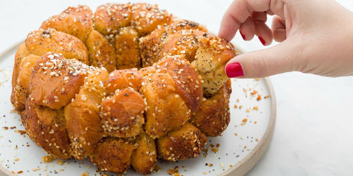 In a bundt pan, layer seasoned dough. Pour over half the melted butter and top with remaining dough. Pour over remaining butter.