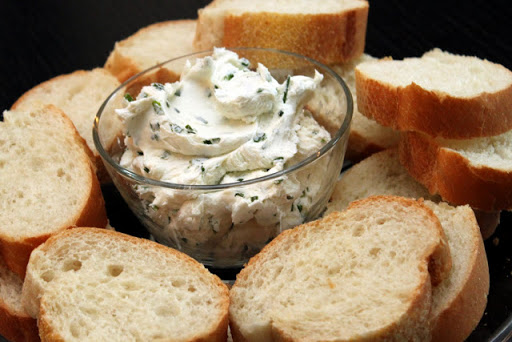 In a medium chilled bowl beat 3 tablespoons whipping cream until thickened. Stir in 6 ounces crumbled goat cheese, 1/4 cup snipped fresh herbs (such as oregano thyme, rosemary, dillweed, and/or oregano), a minced shallot, a couple of teaspoons lemon peel, and a clove of minced garlic. Stir to combine. Season to taste with sea salt and freshly ground peppercorns. thin with additional cream, if desired. Serve on toasted baguette slices.