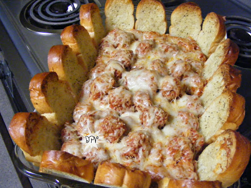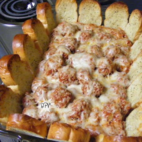 Place enough of the meatballs down the center of a 13x9-inch baking dish (I used about 3/4 of them), leaving a little room around the edges for the bread. Layer half the Italian cheese, Parmesan, and mozzarella over the meatballs. Top with the remaining meatballs and sauce, then layer the remaining half of cheeses over them.