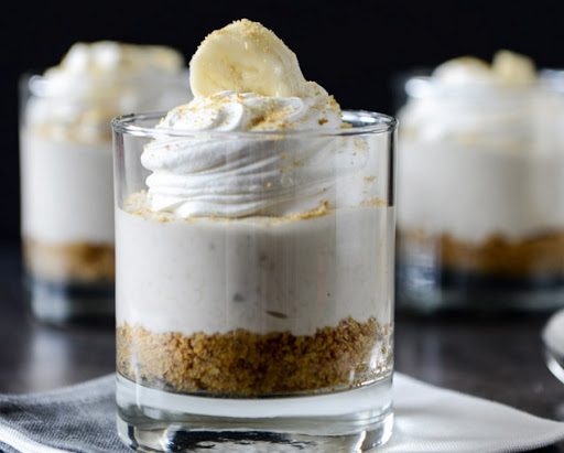 In the bowl of an electric mixer, beat cream cheese smooth, scraping down the sides when needed. Add in mashed banana and beat until completely combined. With the mixer on low speed, slowly drizzle in the condensed milk and then the coconut milk, continuing to scrape down the sides until the mixture is very smooth. Add in vanilla extract and stir until combined. Place some sliced bananas on top of each graham crust, then pour the cheesecake mixture evenly into the 4 glasses or jars. Refrigerate for 4-6 hours.