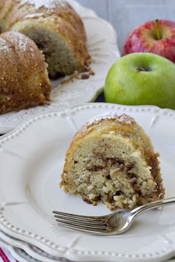 Pour half of the cake batter into the prepared bundt pan. Sprinkle half of the brown sugar and cinnamon mixture evenly over the cake batter and swirl through with a knife. Repeat with the remaining cake batter and brown sugar mixture.