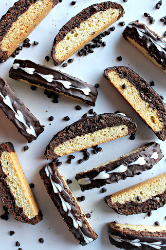 Melt 1/2 cup white chocolate chips in the microwave or double boiler. Add the melted white chocolate to the second portion of the dough, and stir in the remaining 1/2 cup white chocolate chips.