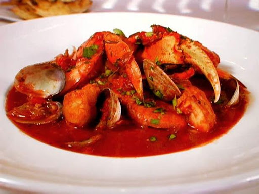 Add the pieces of cooked crab to the sauce and simmer for 20 minutes. Add the clams and simmer for 5 minutes. Add the fish and shrimp and cook until the shrimp turn pink, 4 to 5 minutes. DO NOT STIR. Remove the bay leaves, stir in the remaining chopped parsley and serve immediately with bread.