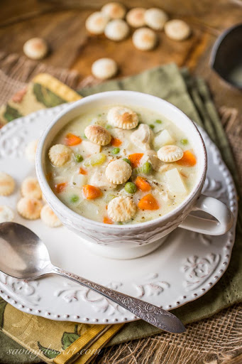 a creamy chicken soup with potatoes, peas, onion, celery and carrots. All the flavors of a homey chicken pot pie without the crust!