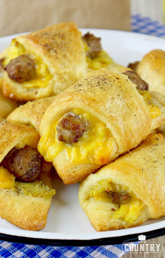 Top each with spoonful of scrambled eggs and 1 sausage link.