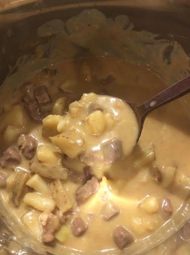 Dice up potatoes and add to the pot. Add chopped carrots Gently mix into the cream of chicken without mixing too much into the water (we made sure there was still water around the outer edge so it would come to pressure).
