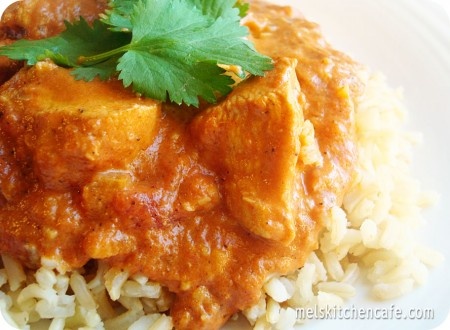Caramelize the onion. Marinate chicken in yogurt, garlic and ginger, then sautee in butter. Add tomatoes, garam masala, and cayenne; simmer. Add cilantro and yogurt at the end. Serve over rice with peas and toasted mustard seeds.
