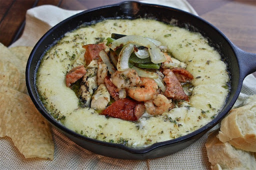 Preheat broiler. Place cheese in a medium cast iron skillet (or in a disposable aluminum pan); let sit at room temperature. Meanwhile, place poblanos on a baking sheet and broil, turning frequently, until skin is black and blistered on all sides. Transfer to a paper bag and seal or place in a bowl covered with plastic wrap; let sit for 5 minutes. Rub the skin off the poblanos with your fingers; core, seed and roughly chop. Put in a grill pan with onions; set aside. Place sausage, chicken and shrimp in separate, resealable plastic bags. In a small bowl, combine the olive oil, garlic, oregano, thyme, salt and peppers. Pour 1 tablespoon of olive oil mixture into each plastic bag; marinate for 15 minutes. Pour remaining olive oil mixture over cheese. Prepare grill for direct cooking over medium heat. Place everything on grill. Grill shrimp and chicken until cooked through. Grill sausage until casings are crisp. Grill peppers and onions until onions are just tender and slightly charred. Grill cheese until fully melted. Slice sausage and chicken into bite-size pieces. Arrange on top of melted cheese along with shrimp, poblano peppers and onions. Serve immediately with French bread.